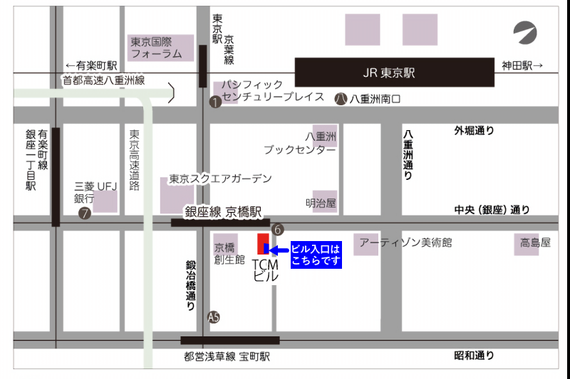 ※病院の入っているTCMビルの出入口は路地(京橋宝通り)側になります。(マップ参照)